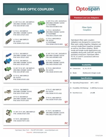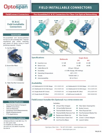 OptoSpan Fiber Optic Adapters are designed to quickly connect two fiber optic patch cables together within a fiber optic networking system. These provide a reliable connection between connectors of the same type or hybrid, without unnecessary splicing or modifications. Solutions for coupling identical connectors are available for LC, LC/APC, SC, SC/APC, FC, FC/APC, ST, MPO, or MTP connectors. Specialized solutions for coupling an SC to LC or SC to ST terminations are also available, for another reliable connection without additional tooling. OptoSpan FieldConnect LC 12-pack includes 12 pre-assembled and pre-polished field-installable LC connectors using index matching gel as an internal mechanical grip, requiring no epoxy curing or on-site polishing. With fast and easy installation, FieldConnect LC Connectors require little on-site time while ensuring premium fiber connections with low loss. Includes a 250µm and 900µm tight buffered fiber holder and assembly jig for accurate alignment and fiber cleave when terminating. Choose from single-mode LC UPC, multimode LC 50/125 µm OM3, or multimode LC 62.5/125 µm OM1, all color coded per industry-standard requirements for easy identification.