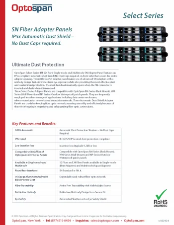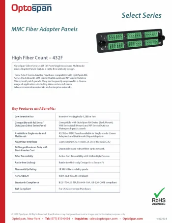 Select Series Adapter Panels is OptoSpan’s premium line of adapter panels, offering the highest fiber capacity (MMC) available today. These modular adapter panels are compatible with RM Series (Rack Mount), WM Series (Wall Mount) and NP Series (Outdoor Waterproof) patch panels. Both series are available with Single-mode (OS2) or Multimode (OM3/OM4) front connections. OptoSpan MTP-LC Fiber Cassettes feature LC connections in the front, as well as high performance MTP Elite in the rear. Select Series fiber cassettes provide a compact high density solution with 24 front Quad LC connectors, and either two 12 or one 24 fiber MTP Elite connector in the rear for backend trunk connections. High Density Series fiber cassettes conform to the LGX standards and are therefore compatible with any LGX patch panel.