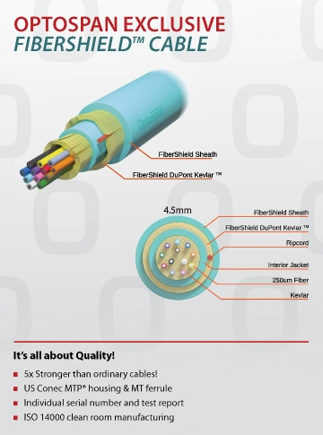 The FiberShield Kevlar layer improves durability by up to five times over standard cabling, safeguarding internal fibers from cuts, tension, and repeated field handling.